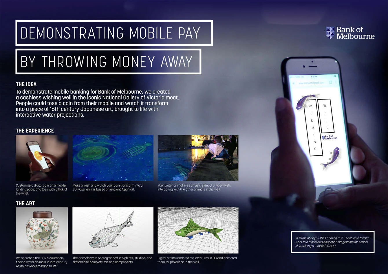 To demonstrate mobile banking for Bank of Melbourne, we created a cashless wishing well in the iconic National Gallery of Victoria moat. People could toss a coin from their mobile and watch it transform into a piece of 16th century Japanese art, brought to life with interactive water projections. In terms of any actual wishes coming true, each coin thrown went to a digital arts education programme for school kids raising a total of $10,000.